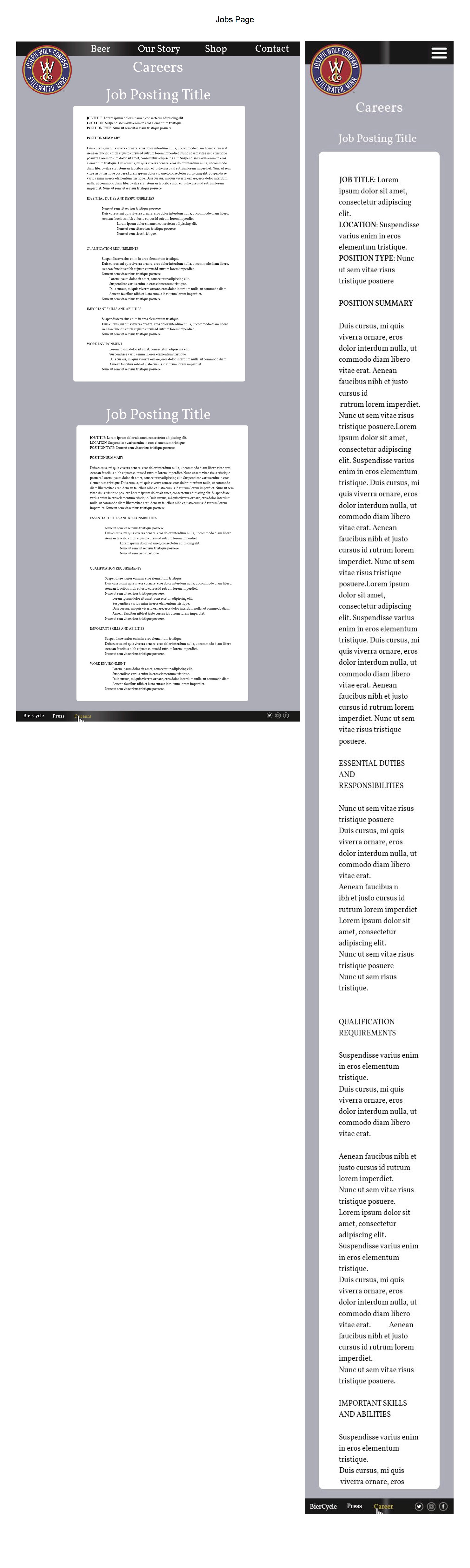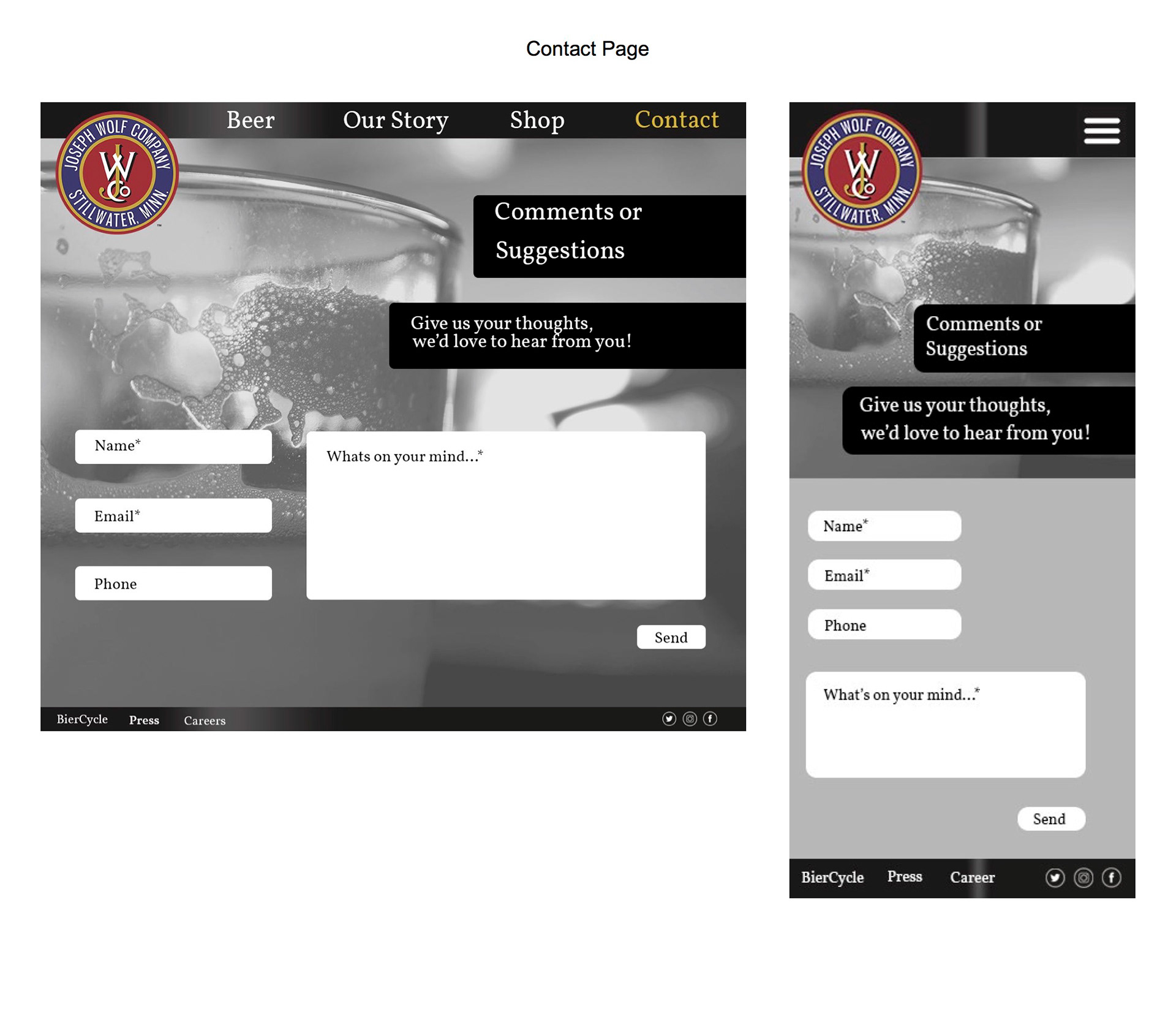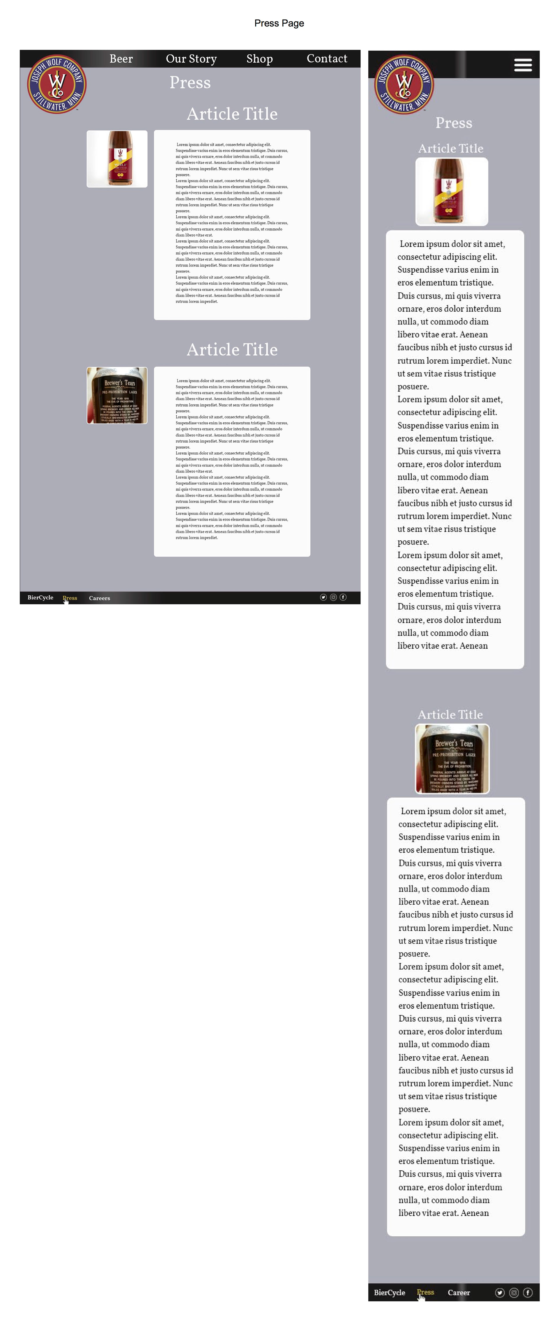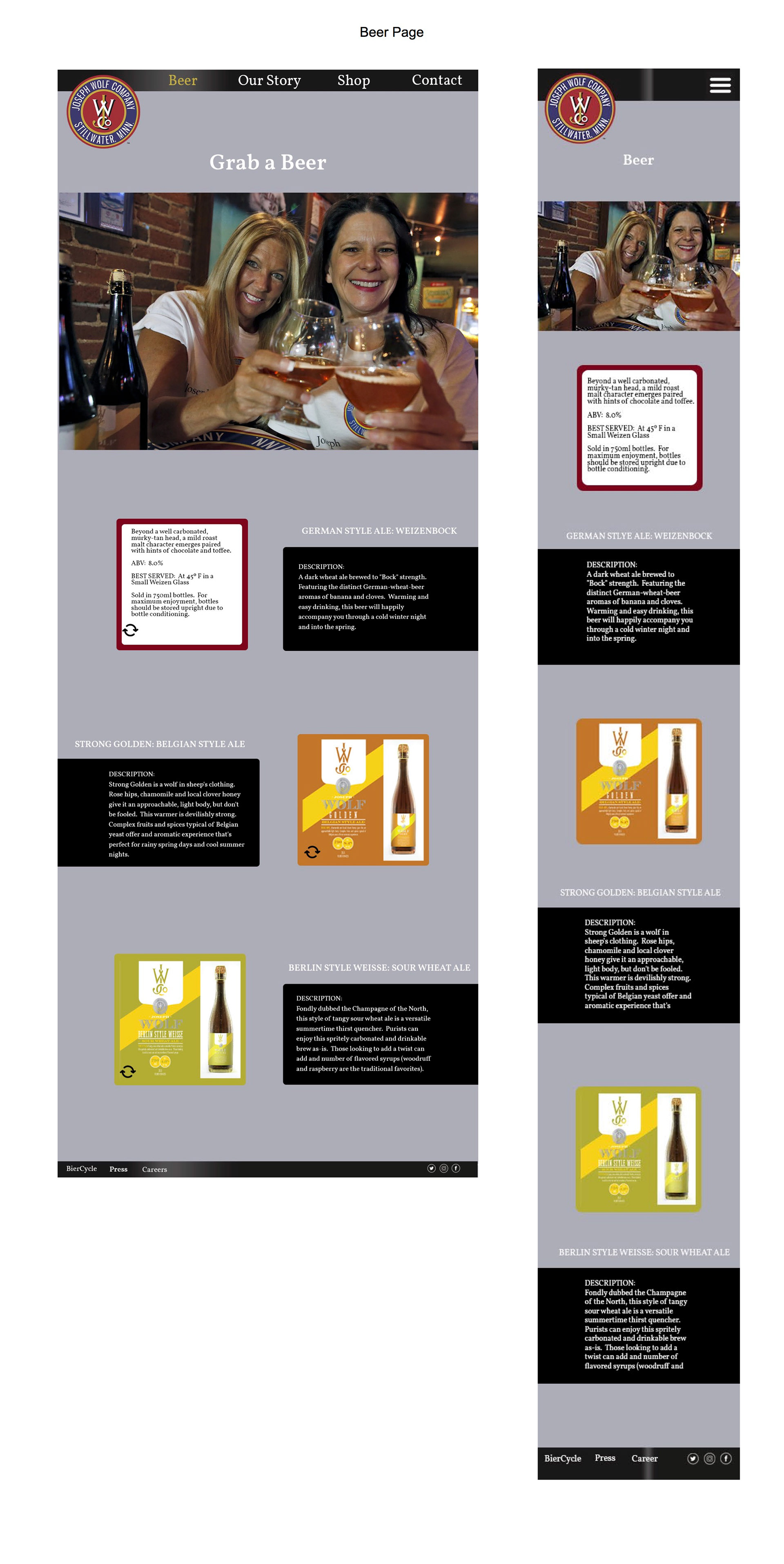 In my web design class, we worked with Joseph Wolf Brewing on creating a new website design. We started out with research on Joseph Wolf including current content, competitors, social media, and current digital presence.After our research we came up with content recommendations as well as a new site structure. The next step was creating home page mock-ups which we narrowed down to four choices to show the client. The final step was to take the clients concept choice and create final mock-ups of all pages with the chosen design. We also came up with final social media recommendations as well as new technology recommendations.