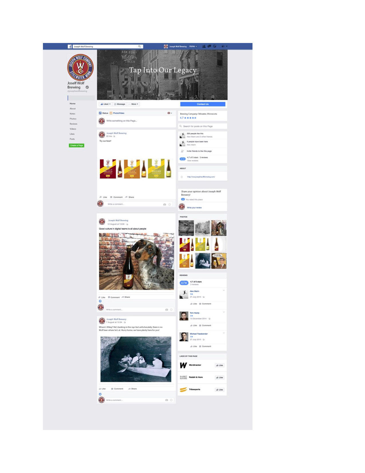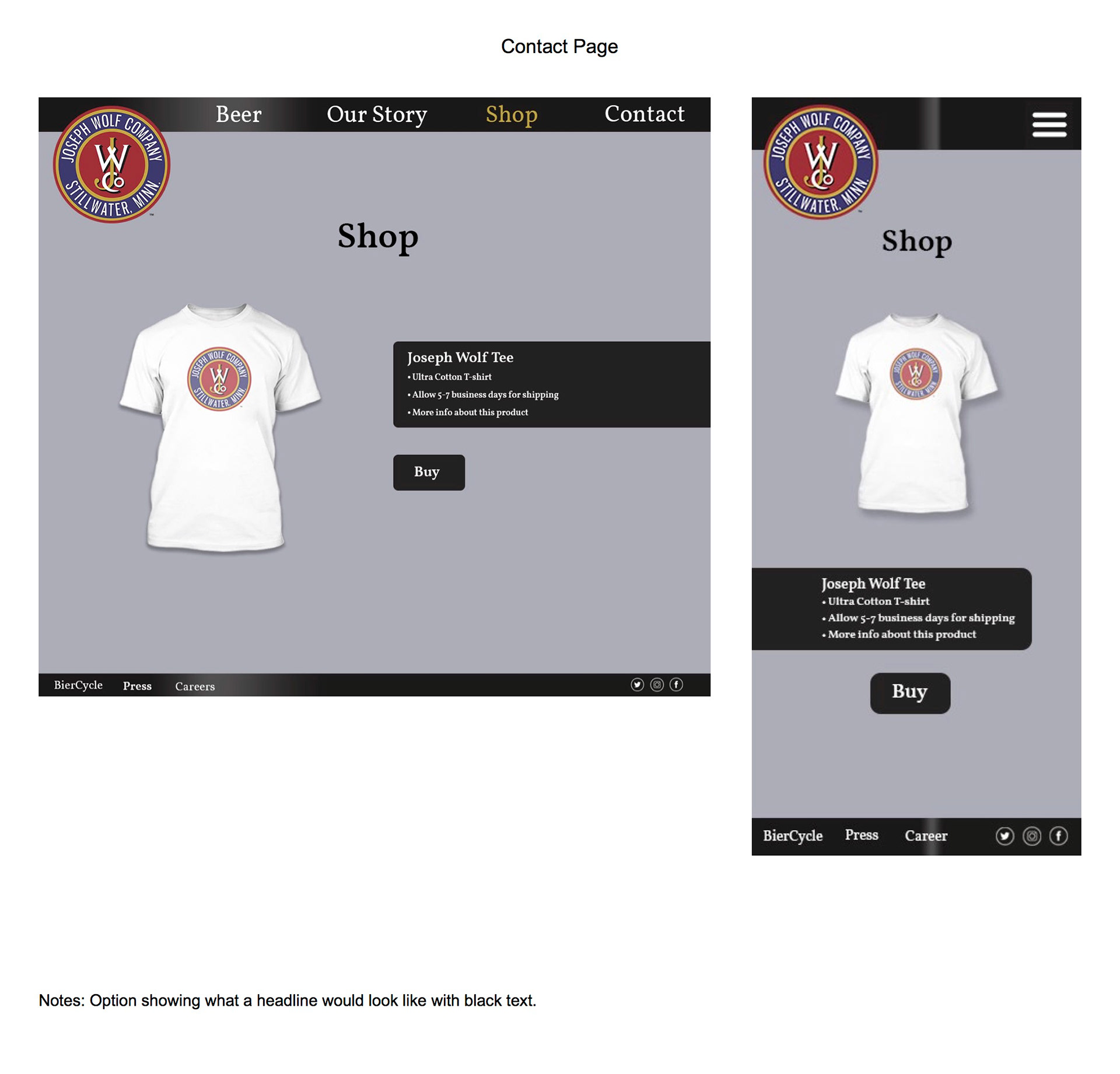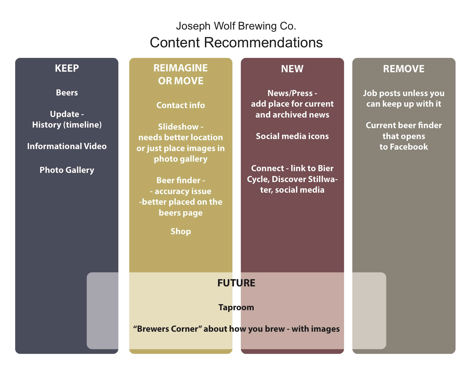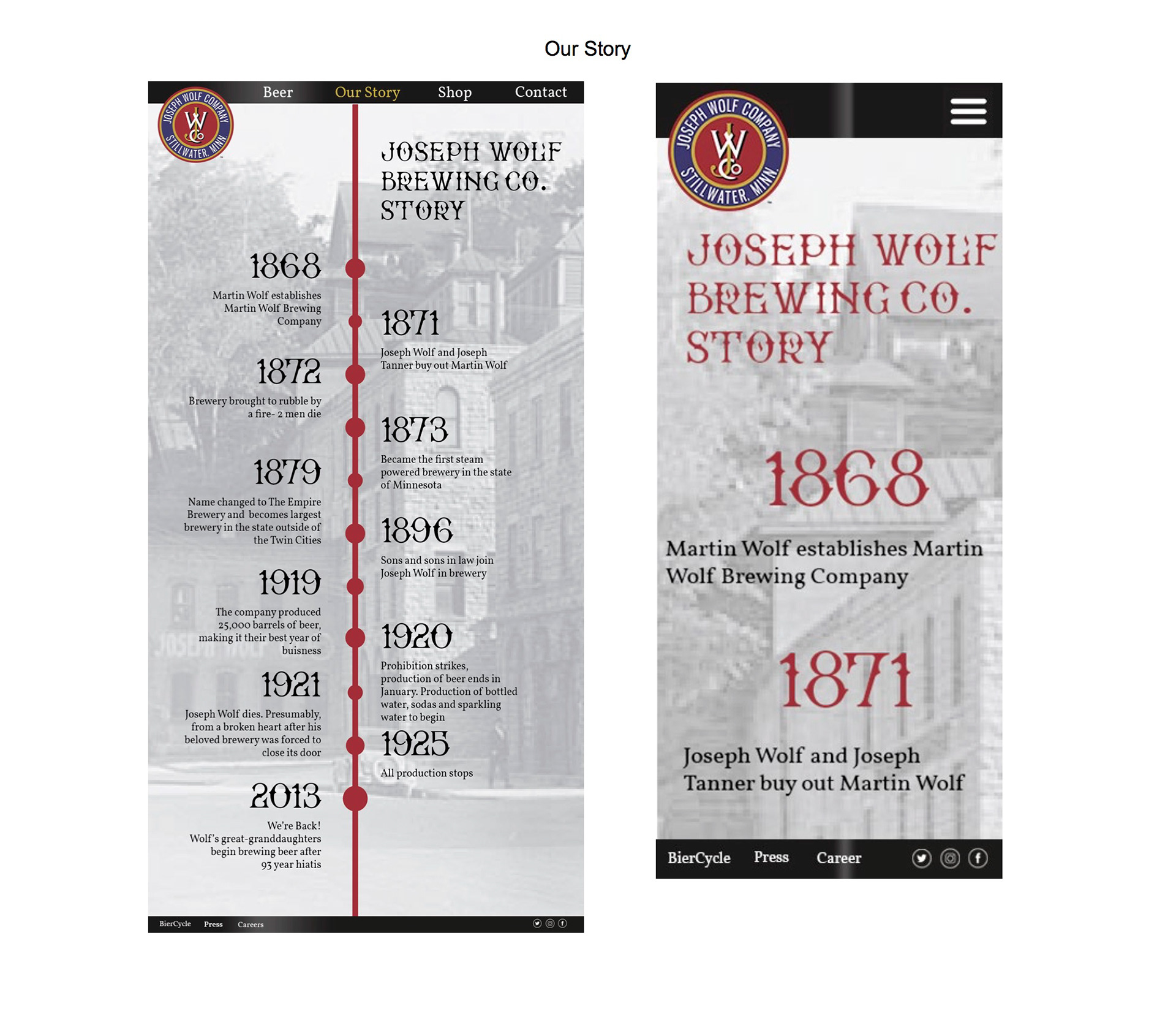 In my web design class, we worked with Joseph Wolf Brewing on creating a new website design. We started out with research on Joseph Wolf including current content, competitors, social media, and current digital presence.After our research we came up with content recommendations as well as a new site structure. The next step was creating home page mock-ups which we narrowed down to four choices to show the client. The final step was to take the clients concept choice and create final mock-ups of all pages with the chosen design. We also came up with final social media recommendations as well as new technology recommendations.
